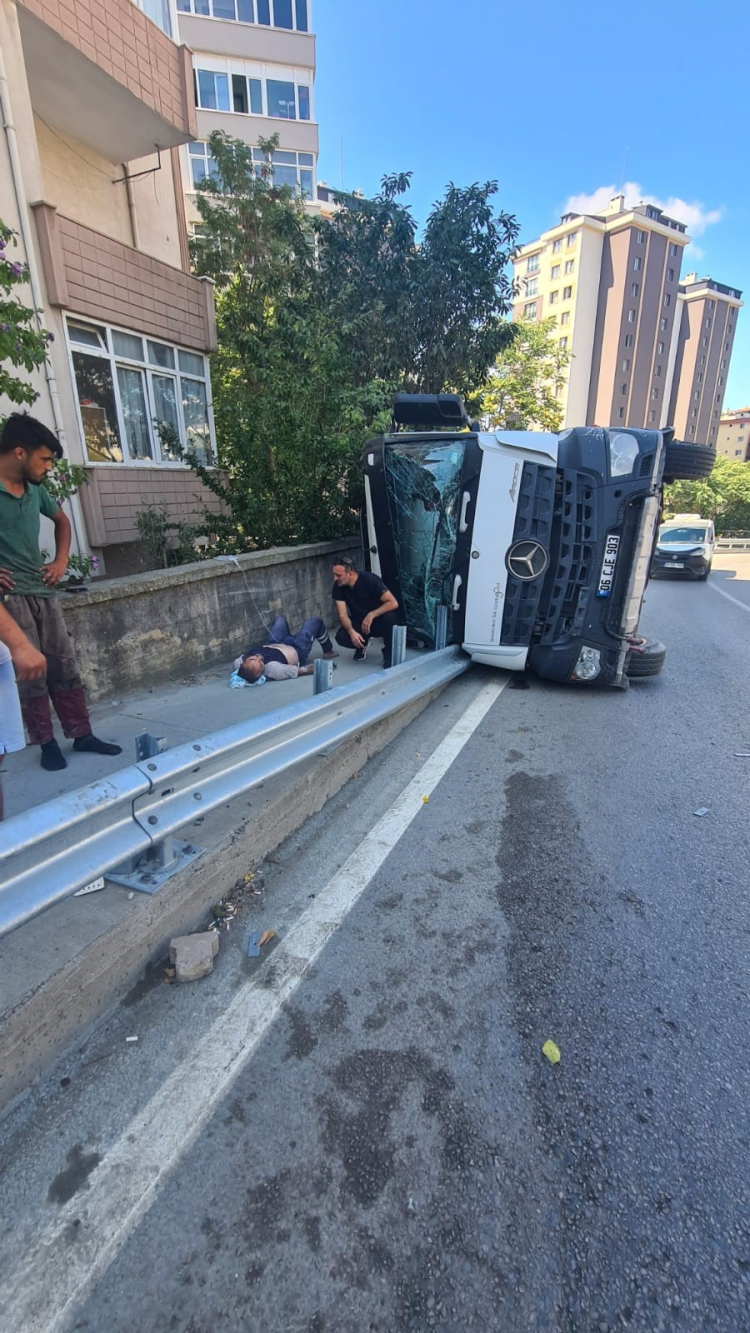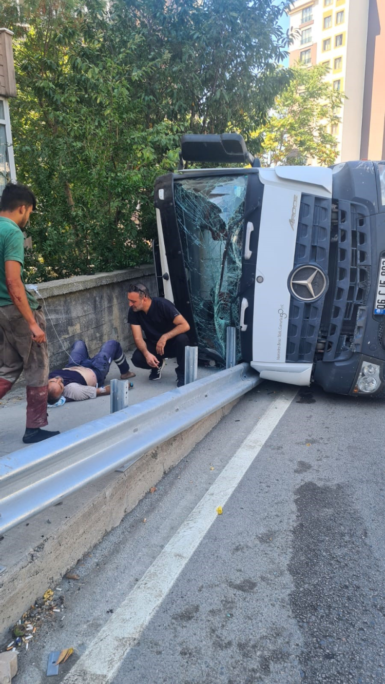 Kartal'da şoförünün direksiyon hakimiyetini kaybettiği beton mikseri yan yattı. Kazada beton mikseri şoförü ve beraberindeki 1 kişi yaralandı. Kaza anı güvenlik kamerasına yansıdı.