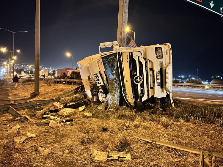 Kaza, Hatay - Adana otoyolu İskenderun otoban girişi mevkiinde yaşandı. Sürücüsünün direksiyon hakimiyetini kaybettiği 06 GE 8546 plakalı tır, orta refüje çarparak yan yattı.