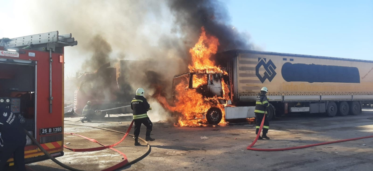 Olay, Eskişehir Taşıyıcılar Kooperatifi’nde meydana geldi. Edinilen bilgilere göre, gece saatlerinde park edilen 3 tırın ortasında bulunan bir tırda henüz bilinmeyen sebepten yangın çıktı. Kısa sürede büyüyen yangın diğer tırlara da sıçradı. Alevleri gören vatandaşlar durumu itfaiyeye bildirdi.