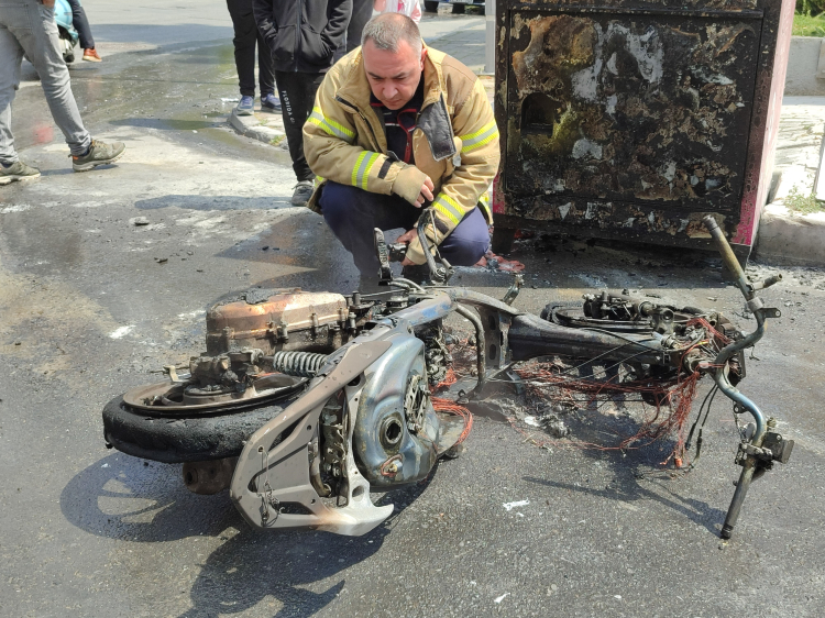 Yangın itfaiye ekiplerinin müdahalesinin ardından söndürülürken, motosiklet kullanılmaz hale geldi.