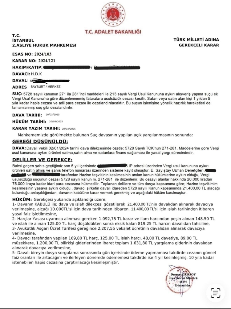 Belge üzerindeki hataların sadece bir hukukçu gözüyle fark edilebileceğini ve vatandaşların bu tuzağa kolayca düşebileceğini ifade eden Ali Haydar Dereli, "Müvekkilimiz Bayburt'tan bizi aradı. Kendisine WhatsApp'tan bir mahkeme kararının iletildiğini ve kararda bugün ödeme yapmazsa ceza ödeyeceğini, hatta hapis cezası çıkacağını belirten ifadeler olduğunu söyledi. Tabii biz, hemen bugün ödeme yapılmasını gerektiren bir durumdan bahsedilince bunun bir dolandırıcılık olayı olabileceğini düşündük. Yine de emin olmak için kararın bize gönderilmesini istedik. Müvekkilimiz kararı WhatsApp'tan gönderdiğinde açıkçası ilk başta gülümsedik. Çünkü kararın başında Adalet Bakanlığı'nın logosu yer alıyordu. Oysa hiçbir mahkeme kararında Adalet Bakanlığı logosu bulunmaz. Zira mahkemeler bağımsızdır. Karara baktığımızda üstte hâkim, altta ise icra müdürünün imzasını gördük. Bu da tamamen hukuka aykırıdır. Çünkü bir mahkeme kararında yalnızca hâkimin imzası bulunur. Kararın içeriğini incelediğimizde üst tarafta ceza hükümleri, alt tarafta ise hukuk hükümleri olduğunu gördük. Ayrıca dava açılış tarihi ile karar tarihinin aynı gün olduğu, esas ve karar numaralarının birbiriyle uyuşmadığı gibi birçok hukuka aykırılık tespit ettik. Bunun üzerine müvekkilimize sakin olmasını ve bunun sahte, dolandırıcılık amaçlı bir belge olduğunu ifade ettik. Müvekkilimiz de rahatladı. Daha sonra başka vatandaşların mağdur olmaması adına bu kararı sosyal medyada paylaştık. Belgenin yapay zekâ ile hazırlandığı oldukça belliydi. Çünkü yapay zekâ kaynaklı birçok hata ve eksiklik bu belgede de mevcuttu. Nitekim esas ve karar numaralarının, tarihlerle uyuşmaması; hukuk ve ceza hükümlerinin karışık şekilde yer alması; hukuk mahkemesi kararı gibi görünmesine rağmen hapis cezası içermesi gibi çok sayıda hata bulunuyordu" dedi.