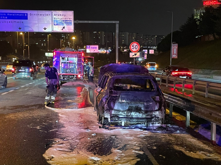 E-5 karayolu Şirinevler mevkisinde seyir halindeki bir araç, bilinmeyen bir nedenle alev aldı.
