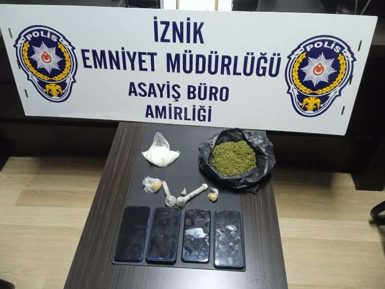 İznik İlçe Emniyet Müdürlüğü ekipleri, asayiş uygulamasında Sakarya yolundan ilçeye giriş yapan ticari taksi içerisindeki S.U., E.B. ve E.Ç. isimli şahısların üstlerinde 100 gram esrar, 75 gram metamfetamin, 10 gram afyon sakızı ile 2 adet payp aparat ele geçirdi. 9 ayrı suçtan aranma kaydı bulunan S.U. ve yanındaki 2 şüpheli gözaltına aldı.