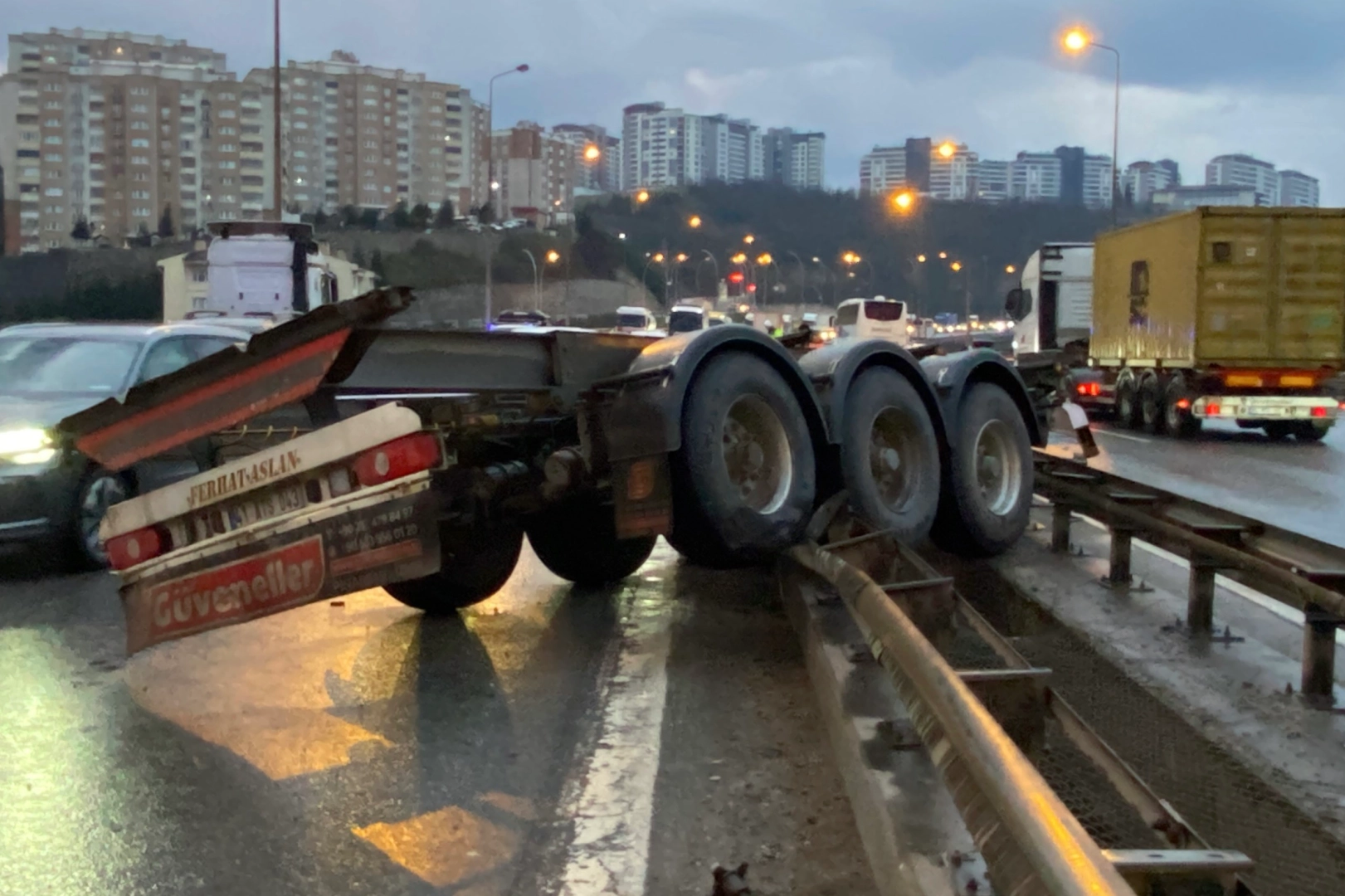 TEM Otoyolu Kocaeli geçişinde sürücüsünün direksiyon hakimiyetini kaybettiği tır makaslama yaptı.