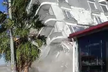 Hatay’ın Arsuz ilçesinde iş makinasıyla yıkılan 5 katlı binanın yerle bir olma anı cep telefonu kamerasına yansıdı.