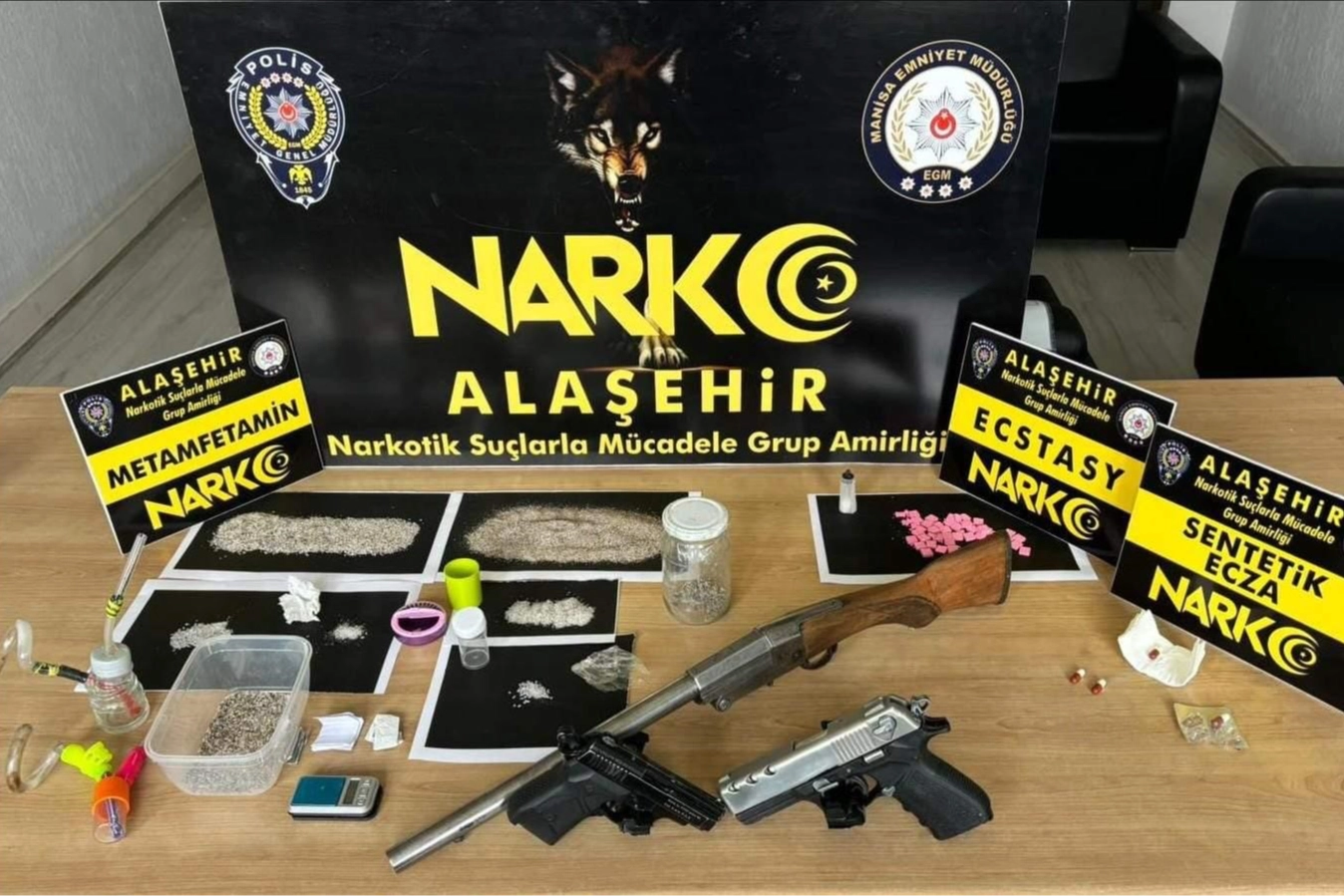 Manisa İl Emniyet Müdürlüğüne bağlı Narkotik Suçlarla Mücadele Şube Müdürlüğü Alaşehir Büro Amirliği ekiplerince "Uyuşturucu, Uyarıcı Madde İmal ve Ticareti” yaptığı değerlendirilen şahısların ikamet ettiği 8 adrese eş zamanlı operasyon düzenlendi. Yapılan operasyonda; İ.A. (31), A.E. (28), R.B (31), E.E.(32), S.M.S. (24), H.B. (31), S.B. (34), Y.Ö. (65) isimli 8 şüpheli şahıs yakalanarak gözaltına alınırken, şahısların yapılan ikamet ve iş yeri aramalarında; 127 gram metamfetamin maddesi, 1 adet hasas terazi, 40 adet extasy hap, 0,56 gram esrar maddesi, 4 adet sentetik ecza hapı, 2 adet içim aparatı, 2 adet tabanca, 1 adet av tüfeği ele geçirildi. Emniyetteki işlemlerinin ardından adli makamlara sevk edilen şahıslardan İ.A. (31), R.B (31), E.E.(32), H.B. (31) ve S.B. (34) isimli 5 şahıs tutuklandı. S.M.S. (24) isimli şahıs adli kontrol şartıyla serbest kalırken, A.E. (28) ve Y.Ö. (65) isimli şahıslar da serbest bırakıldı.