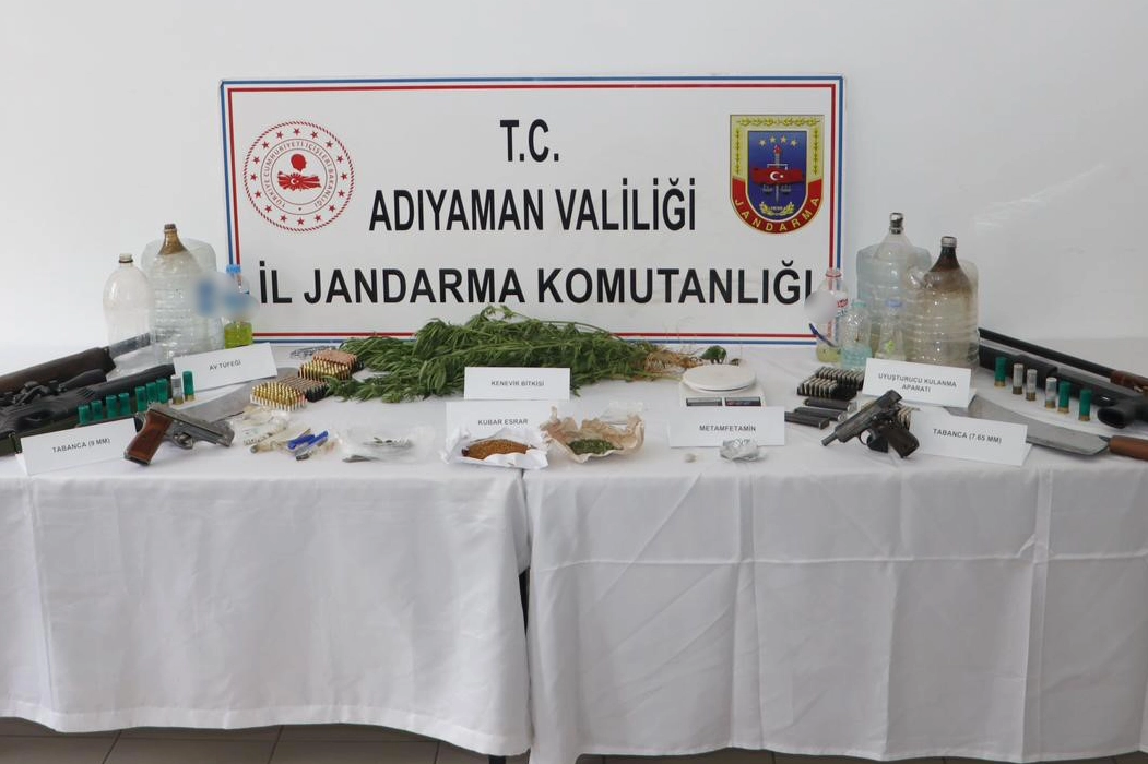 Adreslere yapılan şafak operasyonunda 51 gram kubar esrar, 3 gram sentetik kannabinoid hammaddesi, 25 gram sentetik kannabinoid, 2 gram metamfetamin, 14 kök kenevir bitkisi, 1 hassas terazi, 21 adet uyuşturucu kullanma aparatı, 1 adet 9 mm ruhsatsız tabanca, 1 adet 7.65 mm ruhsatsız tabanca, 107 adet 7.65 mm tabanca fişeği, 221 adet 9 mm tabanca fişeği, 5 adet tabanca şarjörü, 1 adet yarı otomatik av tüfeği, 1 pompalı tüfek, 1 adet tek kırma tüfek, 12 adet av tüfeği fişeği, 44 adet kurusıkı tabanca fişeği, 1 muşta ve 2 kama ele geçirildi. Ele geçirilen malzemeler muhafaza altına alınırken Gölbaşı ilçesinde 7 şüpheli şahıs, Doğanşehir ilçesinde 4 şüpheli şahıs olmak üzere toplam 11 kişi gözaltına alındı. Gözaltına alınan şahıslar, sorgulanmak üzere jandarma komutanlığına götürüldü. Olayla ilgili soruşturma başlatıldı.