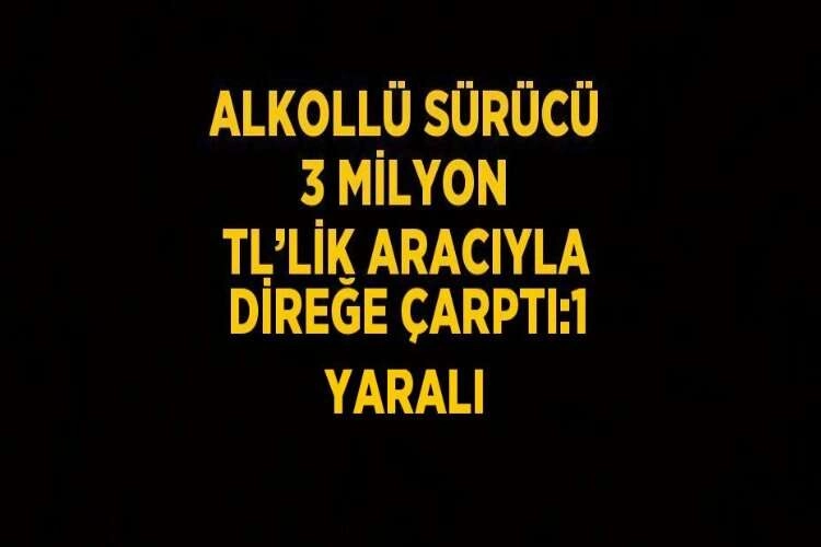 Bursa’nın İnegöl ilçesinde alkollü sürücü 3 milyon TL değerindeki otomobiliyle iş yerinin direğine çarptı, kazada 1 kişi yaralandı.Kaza, İnegöl-Alanyurt yolu üzerinde meydana geldi. İnegöl’den Alanyurt’a seyir halinde olan sürücü Erkan G. (35) yönetimindeki PL 743 EG Mısır plakalı otomobil, sürücüsünün kontrolünden çıktı. Yol kenarındaki kaldırım üzerinden geçerek işyerinin direğine çarparak durabildi. Sürücü kazayı yara almadan atlatırken, yanında bulunan arkadaşı Orhan T. (30) yaralandı. Kaza yerine gelen 112 Acil Servis ambulansında görevli sağlık ekiplerinin ilk müdahalesinin ardından yaralı, ambulansla İnegöl Devlet Hastanesi Acil Servisine kaldırıldı. Kullanılamaz hale gelen lüks araç çekici yardımıyla otoparka kaldırılırken, trafik ekiplerinin yaptığı ilk kontrolde sürücü Erkan G.’nin 425 promül alkollü olduğu tespit edildi. Sürücüye alkollü araç kullanmaktan 3 bin 674 TL cezai işlem uygulandı. Polis kazayla ilgili soruşturma başlattı.