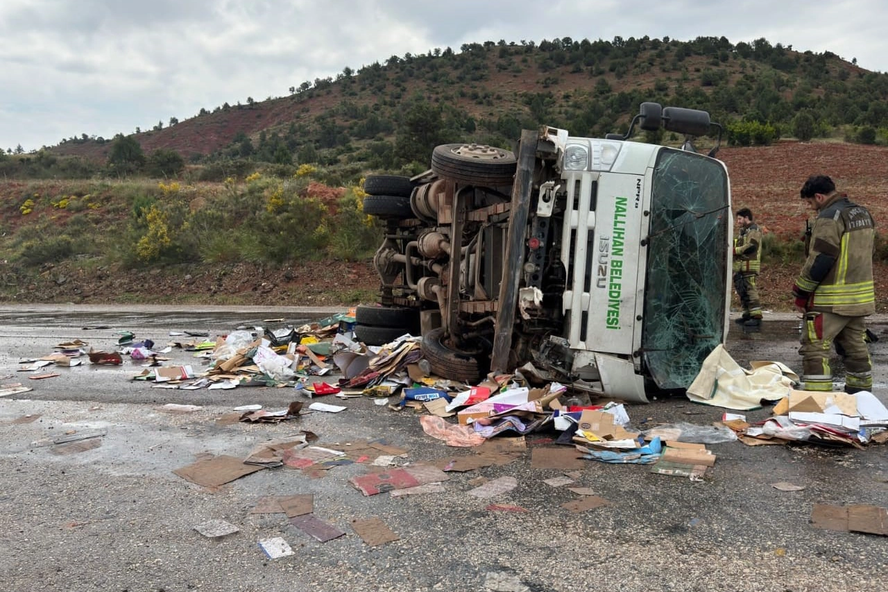 Ankara’da, Nallıhan Belediyesine ait kamyon kontrolden çıkarak devrildi.