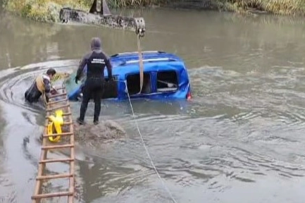 Herhangi bir kişinin olmadığı belirlendi. Halat bağlanan araç çekici yardımıyla kıyıya çıkartıldı.