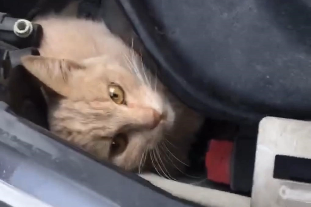 Aracın kaputunu açtığında kediyle karşılaşan sürücü, şaşkınlık yaşarken, hemen kediyi oradan almak için kolları sıvadı.