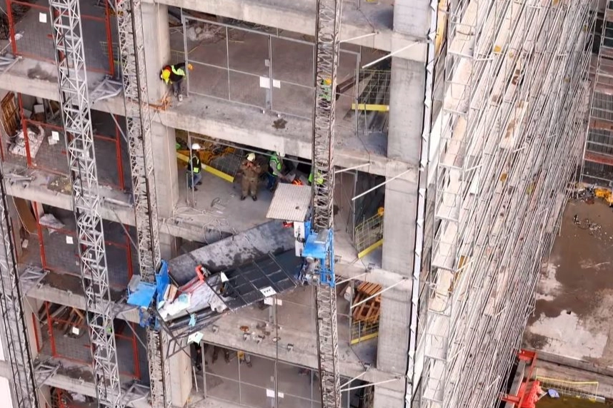 Bir işçi zemine düşerek yaralanırken, asansörde kalan diğer işçi, itfaiyenin yardımıyla kurtarıldı. O anlar dron kamerasına yansıdı.