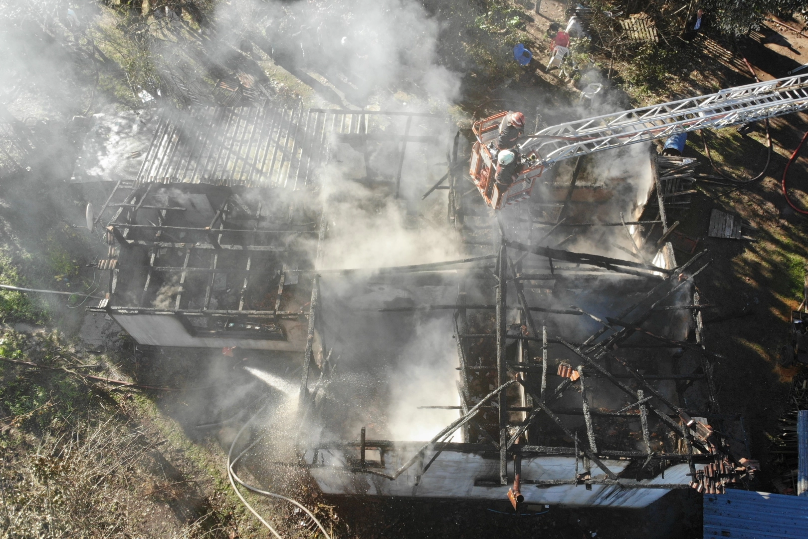 Sakarya'nın Hendek ilçesinde alevlere teslim olan iki katlı ahşap ev kül oldu. Yangın sırasında banyoda olan ve dumanları fark ederek dışarıya çıkan kişinin ise vücudunun çeşitli yerlerinde yanıklar oluştu. Yeşilyurt Mahallesi’nde iki katlı ahşap evde henüz bilinmeyen bir sebepten dolayı yangın çıktı. Alevler evi sararken, müdahalede bulunmaya çalışan İ.D. çeşitli yerlerinden yanarak yaralandı. Durumun haber verilmesi üzerine bölgeye itfaiye, sağlık ve jandarma ekipleri sevk edildi. Olay yerine gelen sağlık ekipleri yaptıkları ilk müdahale sonrasında yaralıyı hastaneye sevk ederken, itfaiye ekipleri ise yangını söndürmek için seferber oldu. Uzun uğraşlar neticesinde yangın kontrol altına alınarak söndürüldü. Yangın sırasında İ.D.'nin banyoda olduğu öğrenilirken, faciaya ramak kalan yangın anları ise cep telefonu kamerasına yansıdı. "Ustaların yardımıyla kapıyı kırıp çıkarttık amcamı" Yanan evde dedesinin kardeşinin oturduğunu ifade eden Furkan Enes Dereli, "Evde bir anne, iki tane de bekar çocuk vardı. Anne 90’lı yaşlarında. Biz dışarıda yemek yapıyorduk, bir sorun yoktu. Sonrasında eve girdik, 5 dakika sonra haber aldık. Evin içinde ustalar vardı. Bir anda alev aldı, sonrasında da alevler her yeri sardı. Ekipler 10 dakika içinde geldi ama geldiklerinde ev kullanılamaz haldeydi. Evin içinde bir tek amcam vardı, o da banyodaydı. Çıktığında alevleri söndürmek için uğraşmış ama söndürememiş. Ustaların yardımıyla kapıyı kırıp çıkarttık amcamı. Elinde ve ayaklarında yanıklar vardı. Ev söndürüldü ama kullanılamaz hale geldi" dedi.
