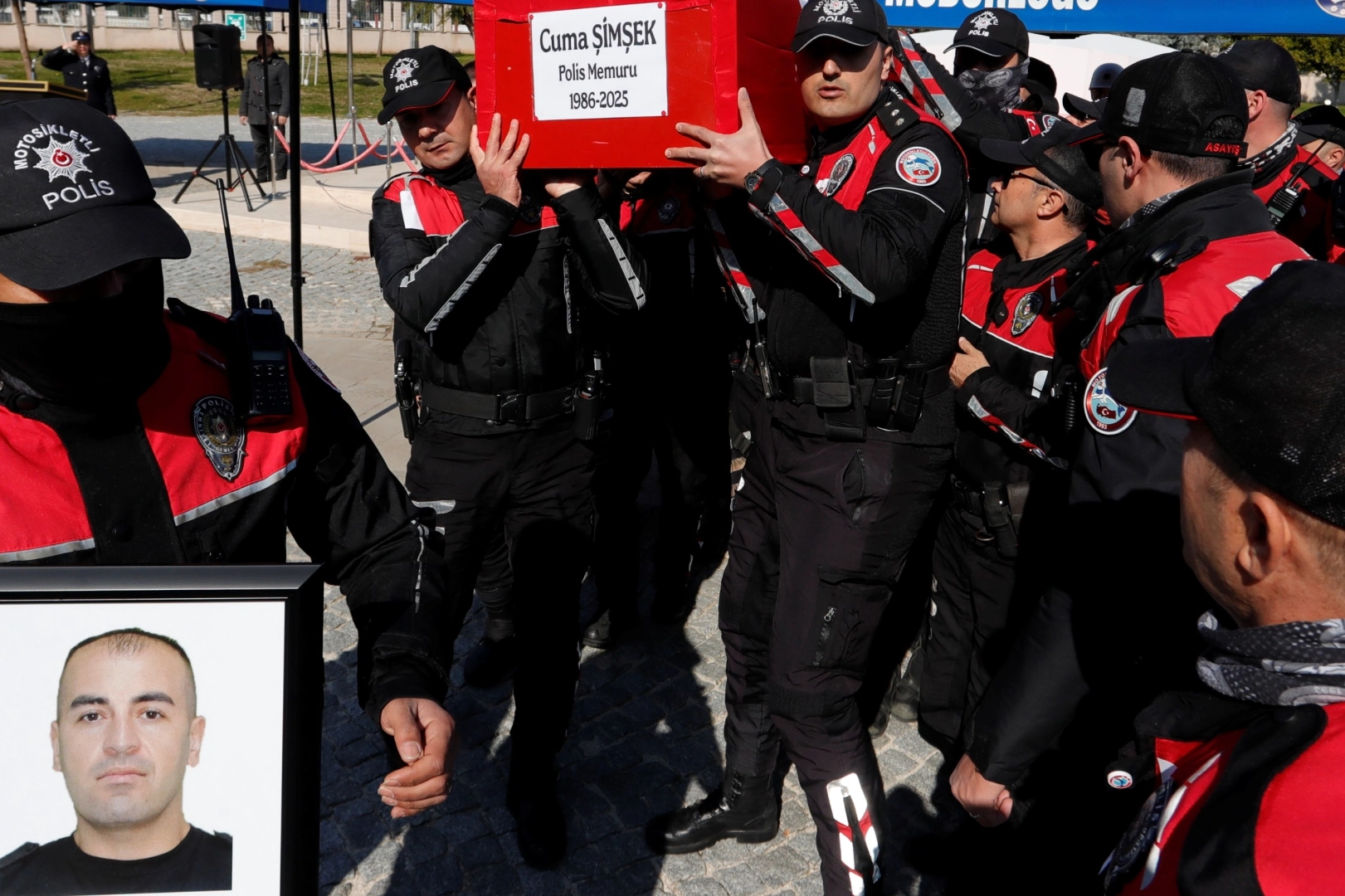 Mesai arkadaşlarının omuzlarında taşındı Antalya Emniyet Müdürlüğü'nde düzenlenecek olan törene Asayiş Şube Müdürlüğü'ne bağlı Motorize Yunus Timleri tarafından tarafından oluşturulan konvoyla getirilen Cuma Şimşek'in cenazesi, okunan duaların ardından toprağa verilmek üzere memleketi Gaziantep'e götürüldü. Şimşek'in tabutu birlikte görev yaptığı mesai arkadaşlarının omuzlarında cenaze aracına taşındı. Tören sırasında Cuma Şimşek'in kızı ve ablası Tülay Alışkan'ın gözyaşlarına hakim olamadığı görüldü.