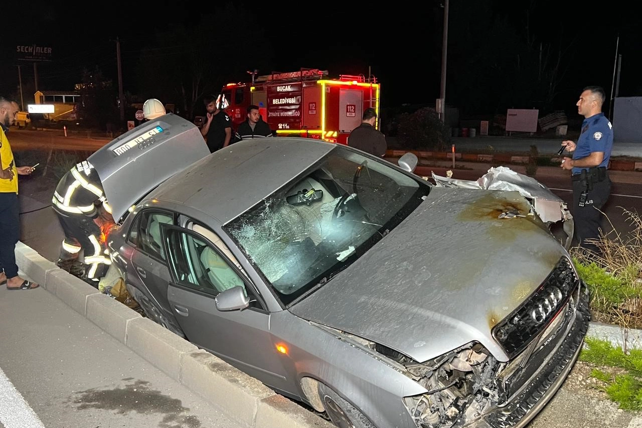 Çevredekiler tarafından alev alan araçtan çıkarılan 2 kişi hastaneye kaldırıldı. Kaza, saat 01.30 sıralarında Burdur'un Bucak ilçesi Alparslan Türkeş Bulvarı Bölge Trafik Denetleme İstasyonu yakınlarında meydana geldi. Edinilen bilgilere göre Antalya'dan Bucak yönüne seyreden Furkan A. (28) idaresindeki 15 EH 008 plakalı Audi marka otomobil, kontrolden çıkarak refüjdeki aydınlatma direğine çarparak alev aldı. Kazada yaralanan sürücü Furkan A. ve yanındaki Beyzanur D. (22) vatandaşlarca araçtan çıkarılarak güvenli bölgeye taşındı.