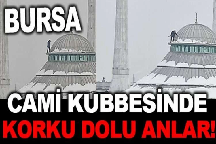 Bursa'da karla kaplı caminin kubbesinde hiçbir önlem alınmadan yapılan temizlik çalışması görenlere korku dolu anlar yaşattı.