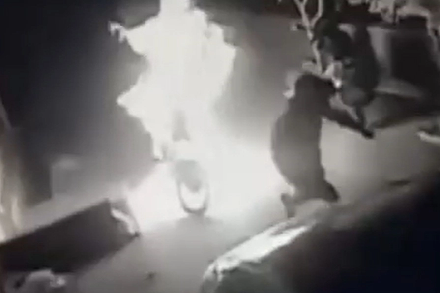 Güvenlik kamerasına yansıyan kundaklama olayında ise apartman önünde park halinde olan motosikletin yanına gelen bir kişinin motosikletin üzerine yanıcı bir madde döktükten sonra ateşleyip olay yerinden kaçtığı görülüyor. Sonrasında ise motosiklet alev topuna dönüyor.