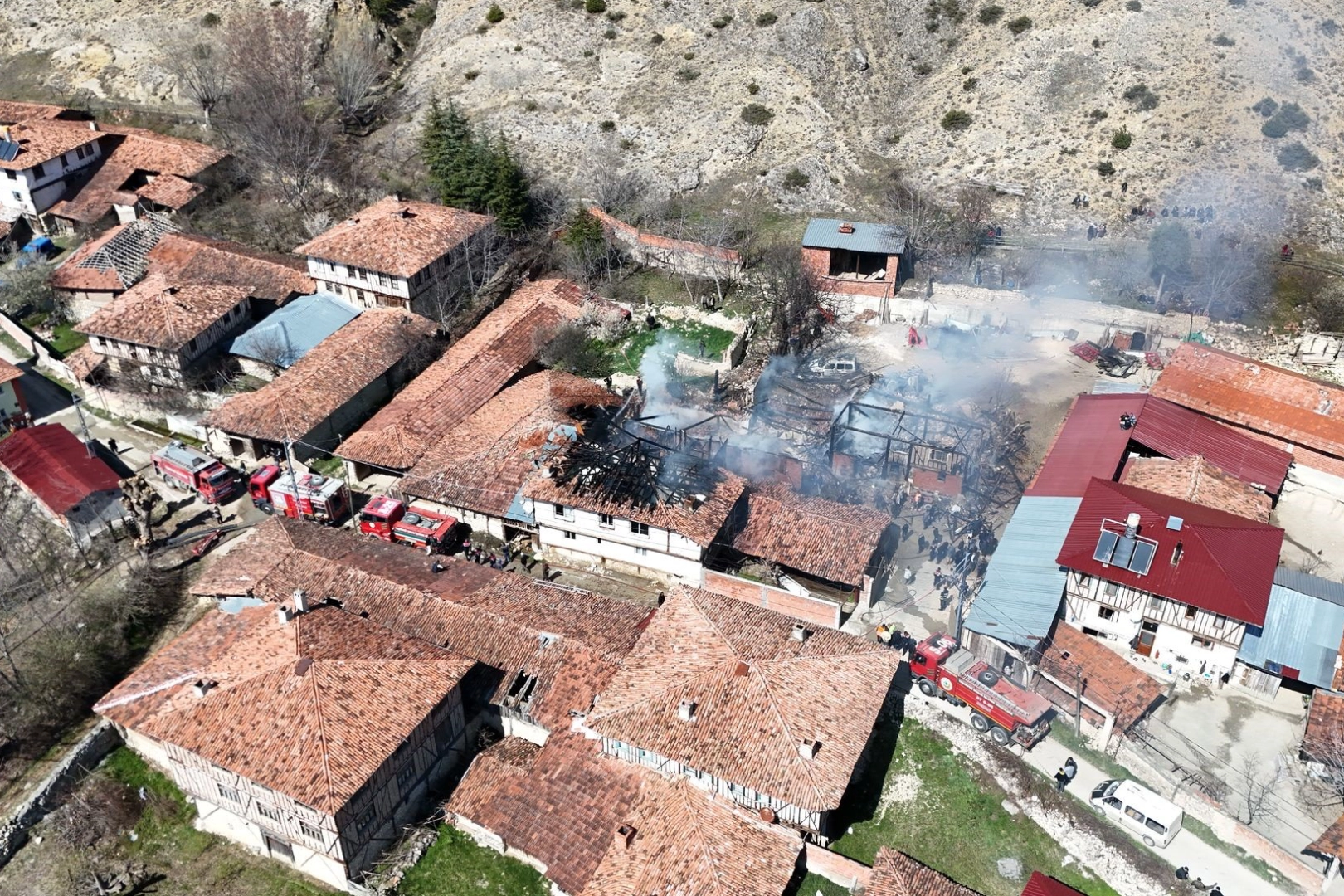 Kastamonu'nun Taşköprü ilçesinde çıkan yangında, 2 ev, 2 depo ve 1 araç yandı.