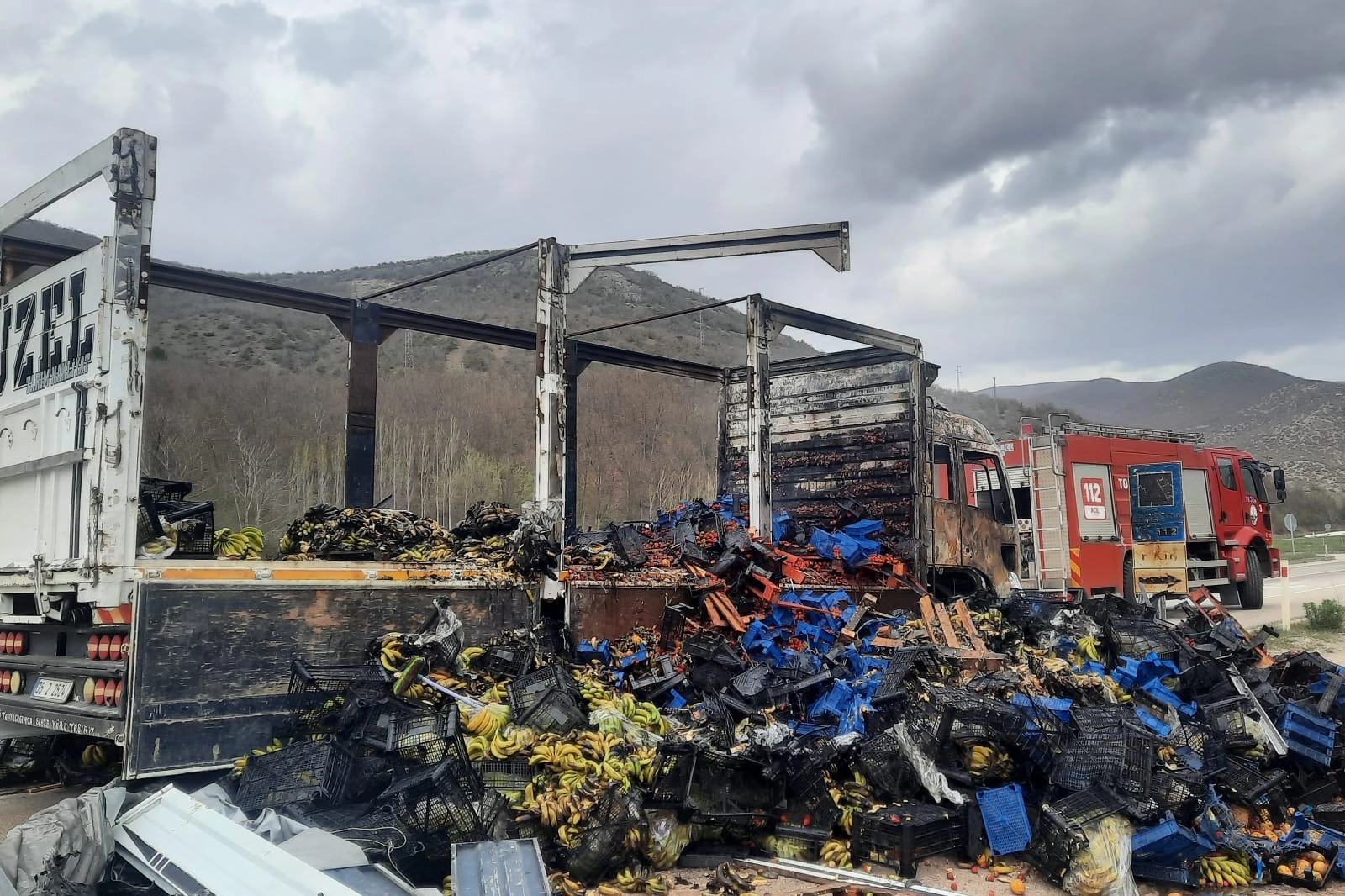 Tokat’ta seyir halindeki çilek yüklü bir kamyon yanarak kullanılamaz hale geldi.