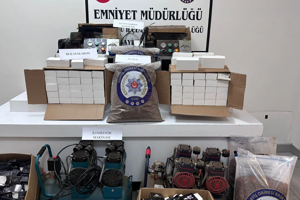 Evde yapılan aramalarda 2 adet tütün sarma makinesi, 2 adet hava kompresörü, 18 kilogram tütün, 800 adet boş sigara kutusu, 23 bin adet boş makaron ele geçirilirken, şüphelilerden birinin "çocuğa karşı cinsel taciz” suçundan arandığı belirlendi.