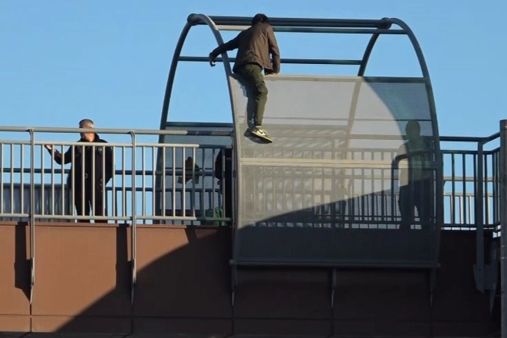 Antalya'da yaya üst geçidinde demir bariyerlere çıkan genç, yürekleri ağza getirdi.