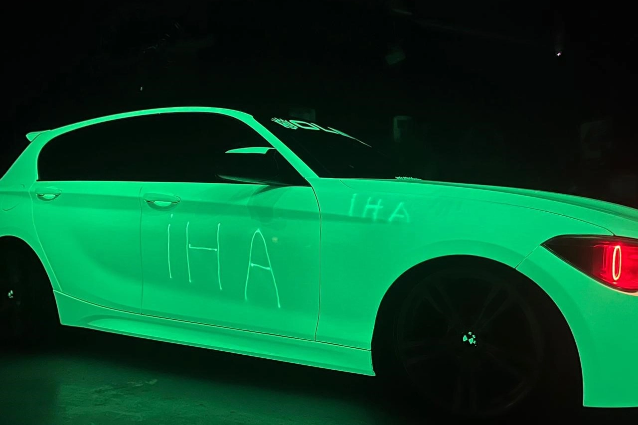 Eskişehir'de 16 yıldır boya koruma filmi kaplaması yapan esnafın özel malzeme ile kapladığı otomobil gündüzleri beyaz iken geceleri yeşil bir renge bürünüp adeta ışık kaynağı gibi parlıyor.