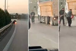 Anayolda ilerleyen bir kamyon sürücüsü, kamyonun tekerinin fırlamasıyla şoke oldu. Hemen aracı kenara çeken sürücü, eline aldığı suyla lastiklerin bulunduğu kısımda çıkan alevleri söndürmeye çalıştı.