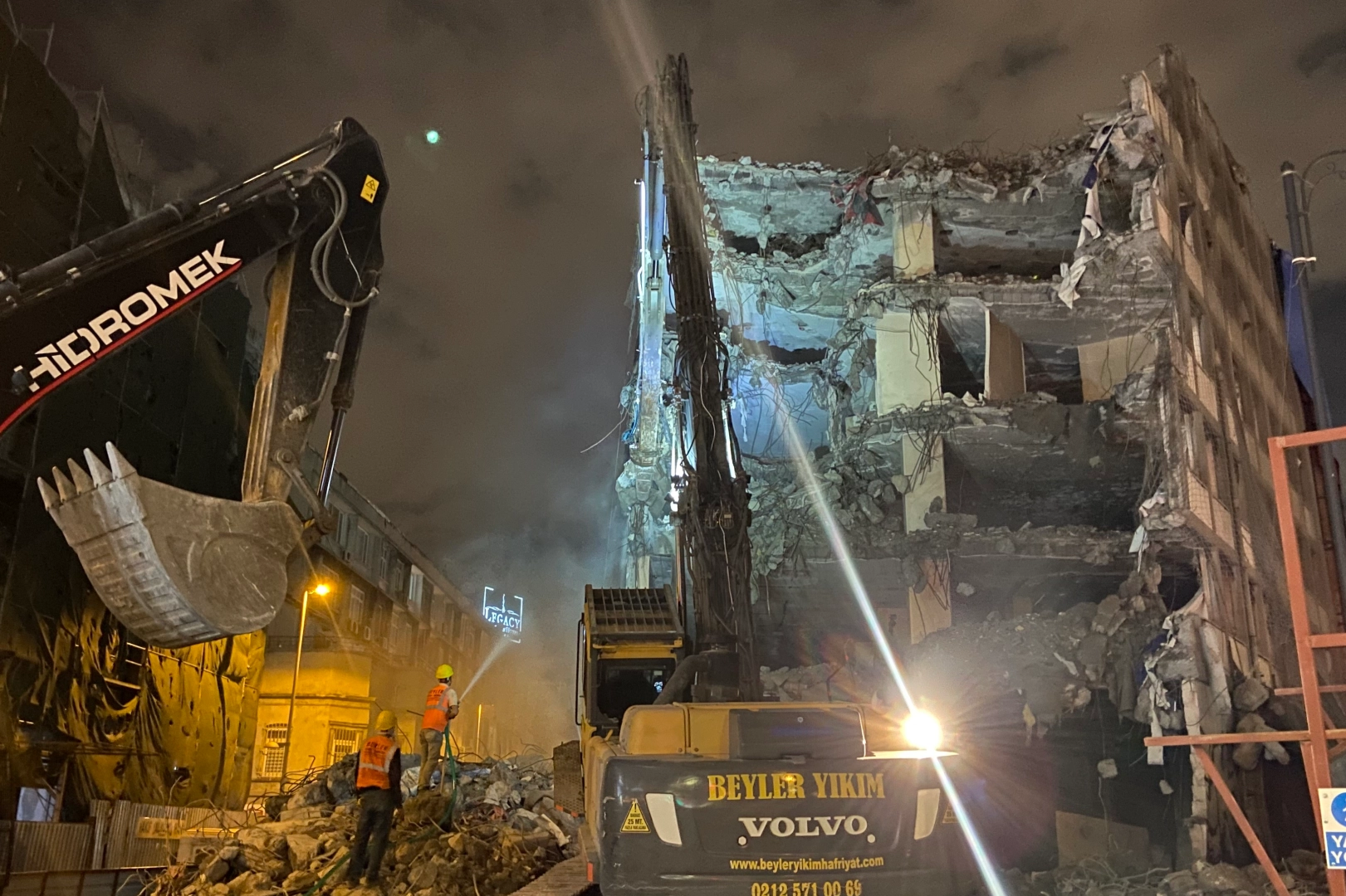 Binanın yıkım çalışmaları, trafiği tehlikeye düşürmemek ve yoğunluk yaşanmaması için gece saatlerinde yapılırken yıkım işlemlerinin bir kaç gün daha süreceği öğrenildi.