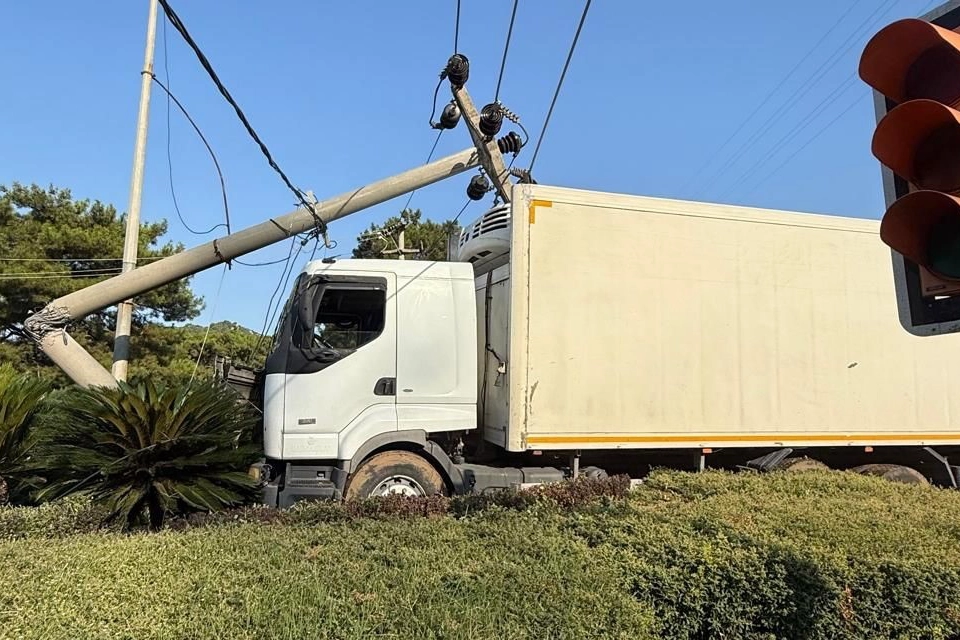 Muğla’nın Marmaris ilçesinde frenleri tutmayan kamyon refüje çıkarak beton direğe çarparak durabilirken, direk ikiye bölündü.
