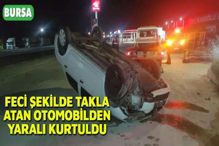 Kaza, Bursa'nın Orhangazi ilçesinde meydana geldi. Edinilen bilgiye göre, Yalova istikametinden Bursa istikametine doğru gitmekte olan A.D. (54) idaresindeki 34 RL 7956 plakalı otomobil benzinlik yakınlarında kontrolden çıktı. Benzinlik girişindeki kaldırıma çarparak takla atan otomobil ters döndü. Kaza sebebiyle olay yerine ambulans sevk edildi. Takla atan otomobilin sürücüsü A.D., hafif yaralı olarak araçtan çıkarılarak Orhangazi Devlet Hastanesine kaldırıldı. Jandarma ekipleri kaza ile ilgili soruşturma başlattı.