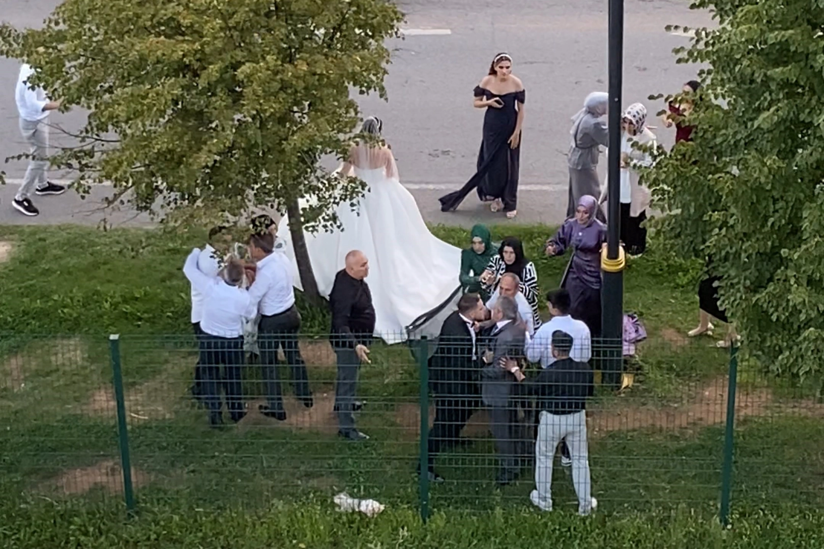 Gelin ve damat yol ortasında kavga eden yakınlarının arasında kaldı. Genç çiftin en mutlu günlerinde yaşanan bu anlar saniye saniye bir vatandaşın kamerasına yansıdı.