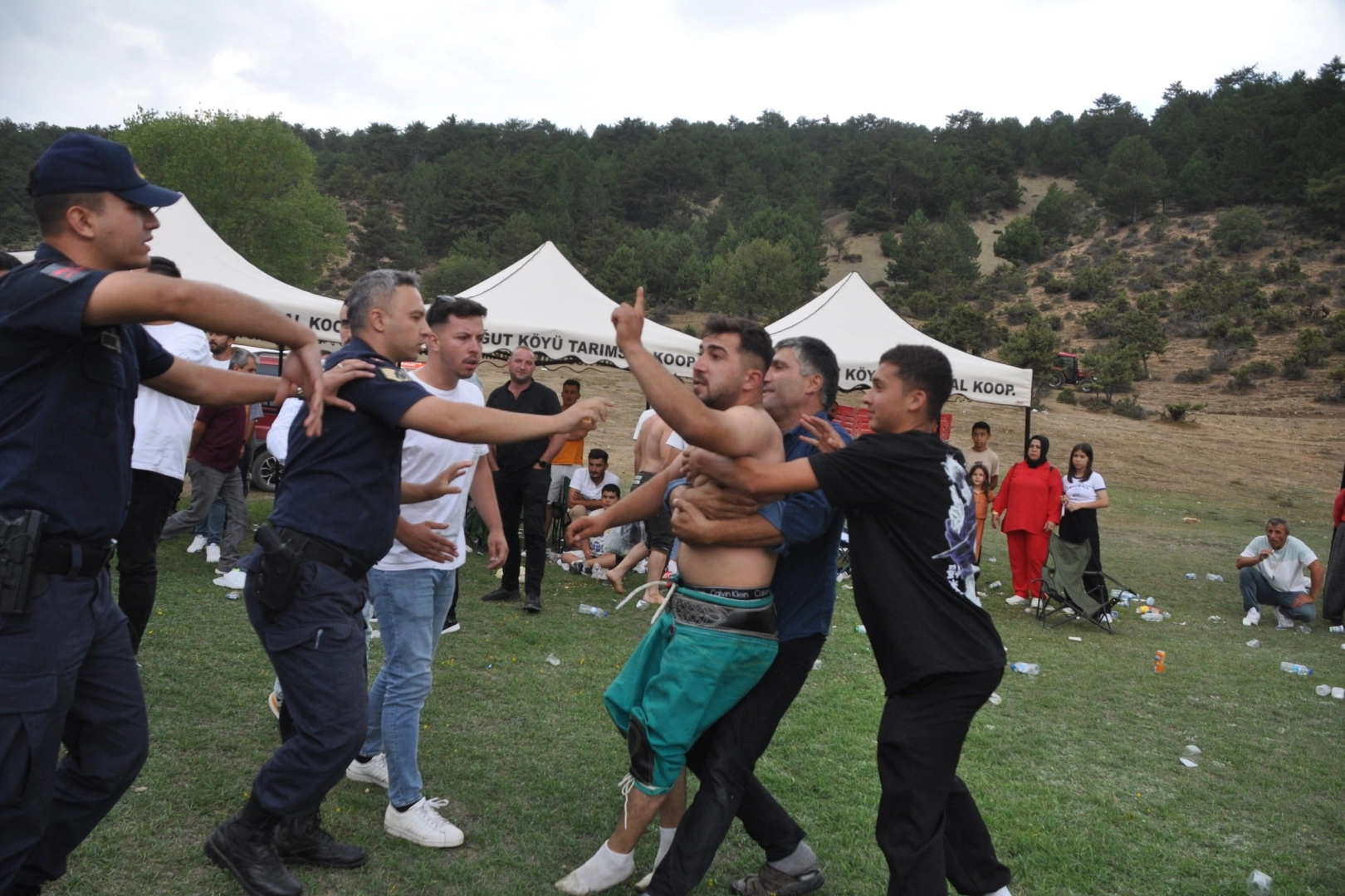 Babasına küfrettiği iddia edilen vatandaşa saldırmaya kalkışan güreşçi, güçlükle sakinleştirildi. Jandarma ekipleri ve vatandaşlar tarafından zor tutulan güreşçi yanlış anlaşılma olduğunu öğrenince güreş müsabakalarına devam edildi.