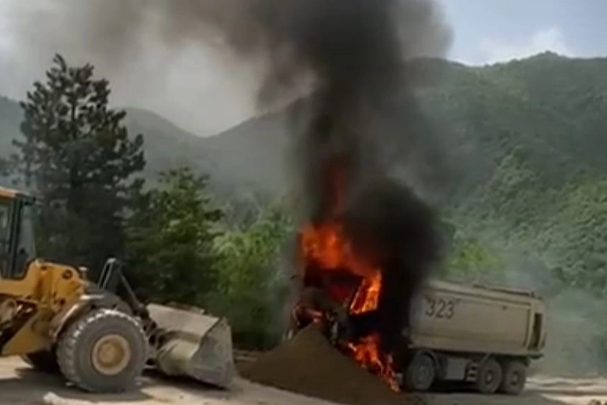 Sinop’un Türkeli ilçesine bağlı Gökçealan köyünde yol inşaatında kullanılan taş yüklü bir kamyon, seyir halindeyken aniden alev aldı.