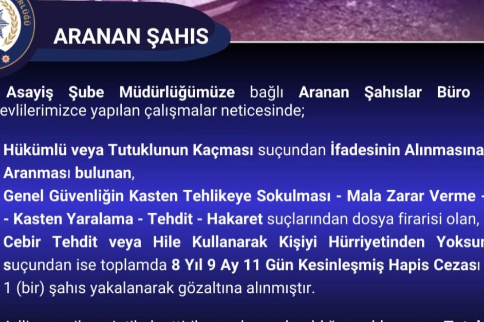 Bu çerçevede, ‘Cebir Tehdit veya Hile Kullanarak Kişiyi Hürriyetinden Yoksun Kılma’ suçundan toplamda 8 yıl 9 ay 11 gün kesinleşmiş hapis cezası bulunan 1 şahıs yakalanarak gözaltına alındı. Adliyeye sevk edilen şahıs, tutuklanarak cezaevine gönderildi.