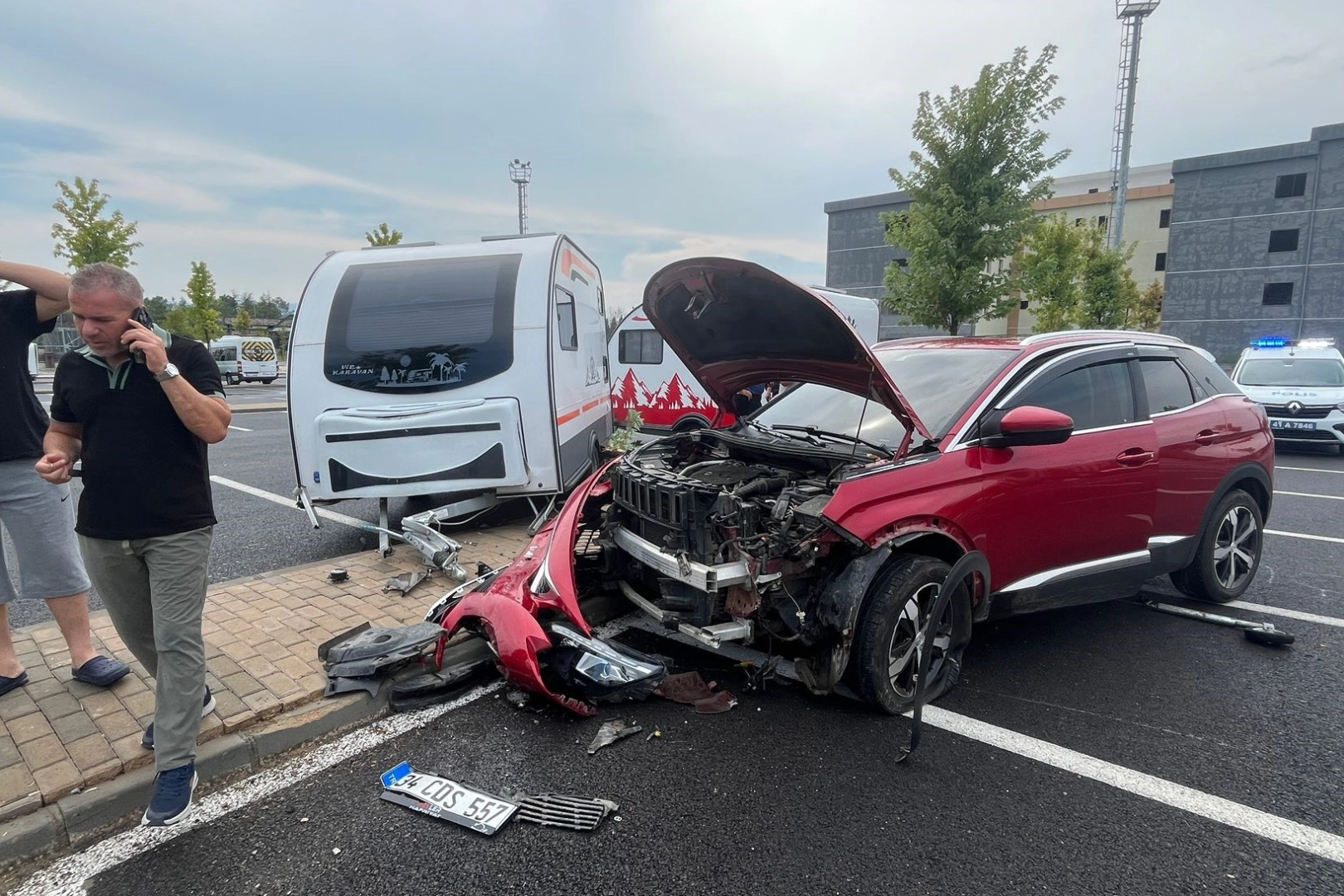 Kocaeli'nin Derince ilçesinde hastane otoparkında kontrolden çıkan otomobil önce ağaca, ardından da park halindeki karavana çarptı.