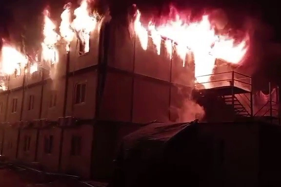 Hatay'da inşaat işçilerinin kaldığı konteyner yatakhane alevlere teslim olarak yandı.