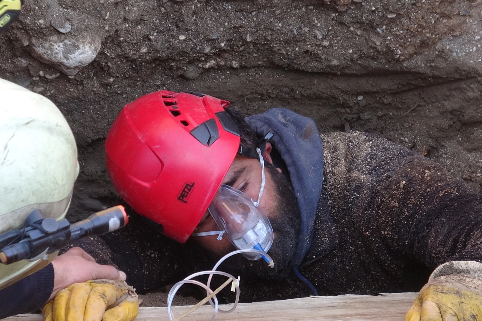 İtfaiye eri elini tutarak moral verdi Bu sırada çalışma yapılan alanda meydana gelebilecek yeni bir toprak kaymasına karşı ekipler Eyüp Şanlı'nın zarar görmemesi için çevresine tahtalardan bir bariyer oluşturdu. Sağlık ekipleri de genç işçinin daha rahat nefes alabilmesi için toprak altında bulunan Eyüp Taşlı'ya oksijen maskesi taktı. Bu sırada olayı haber alarak gelen Taşlı'nın bir yakını polis ve jandarma ekipleri tarafından sakinleştirildi. Yaklaşık 2.5 saat süren hummalı bir çalışmanın ardından toprak altında kalan işçi bulunduğu yerden çıkartıldı. İlk müdahalesi olay yerinde hazır bekleyen 112 Acil Sağlık ekipleri tarafından yapılan Taşlı, ambulansla Akdeniz Üniversitesi Tıp Fakültesi Hastanesi'ne kaldırıldı.