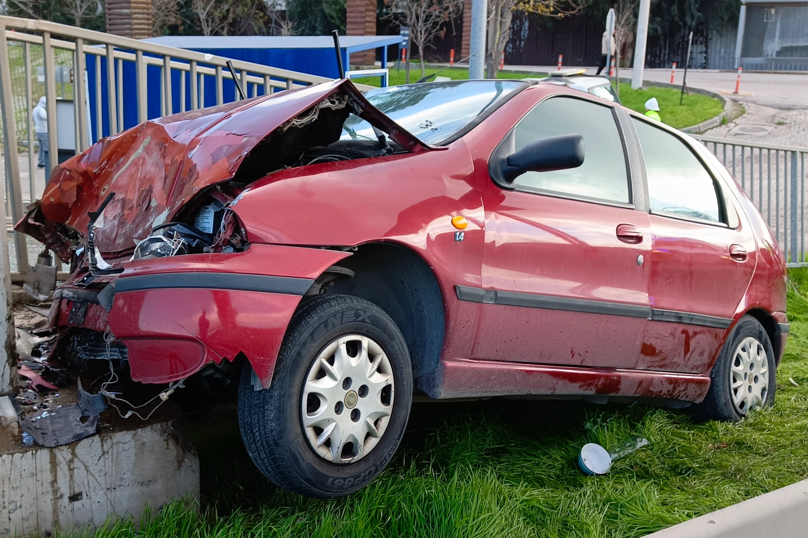 Kaza, İzmir - Çanakkale kara yolunda öğle saatlerinde meydana geldi. Edinilen bilgiye göre, İzmir'den Bergama yönüne seyreden Nurcan Yeniyurt idaresindeki 35 NJN 52 plaka Fiat marka otomobil, Aliağa ilçesine geldiğinde Şehit Kemal Mahallesi'nde henüz belirlenemeyen bir nedenle kontrolden çıkarak yol kenarındaki bariyeri aşıp yaya üst geçidinin ayağına çarptı.