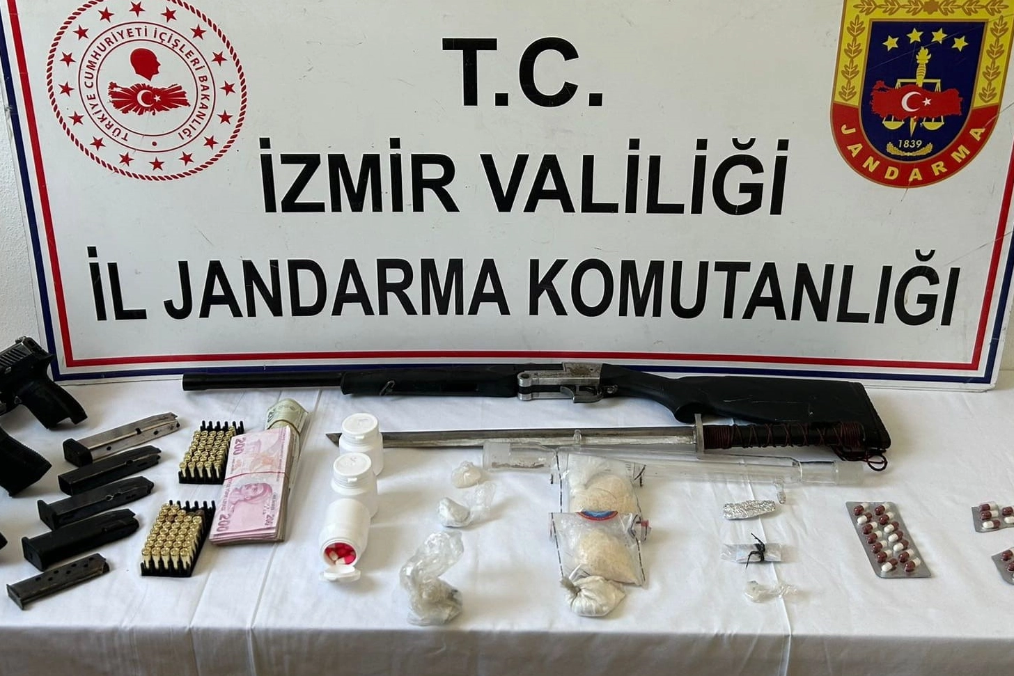 Operasyonlarda gözaltına alınan 16 şüphelinden 7'si tutuklandı. İzmir İl Jandarma Komutanlığı ekiplerince, terör ve organize suç örgütlerinin finans kaynaklarının kurutulması, uyuşturucu madde ticareti ve kullanımının engellenmesi maksadıyla yürütülen çalışmalar dahilinde, 1 - 10 Mayıs tarihleri arasında Çiğli, Kiraz, Menderes, Ödemiş, ve Torbalı ilçelerinde operasyonlar düzenlendi. Belirlenen adreslere yapılan baskınlarda 3 kg. likit esrar, 407 gram kubar esrar, 250 gram kokain, 130 gram metamfetamin, 324 adet sentetik hap, 955 kök kenevir bitkisi, 3 adet tabanca, 8 adet tabanca şarjörü ve 77 adet tabanca fişeği, 2 adet av tüfeği ve 44 adet av tüfeği kartuşu, 2 adet hassas terazi, 3 adet uyuşturucu kullanma aparatı, suçtan elde edildiği değerlendirilen 55 bin 380 Türk Lirası ve 2 adet çeyrek altın ele geçirildi. Olaylara karışan 16 şüpheli şahsa yasal işlem yapılırken, bunlardan 2'si adli kontrol şartıyla serbest bırakıldı, 7 kişi de tutuklanarak cezaevine gönderildi.