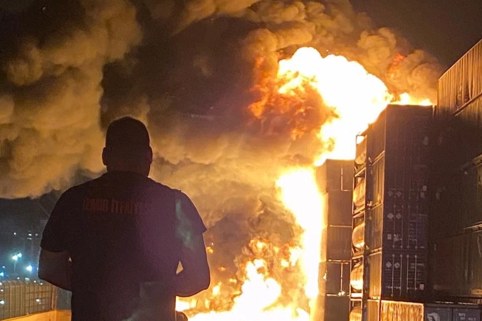 İzmir'in Aliağa ilçesinde sabaha karşı çıkan Nemport Limanı konteyner yangını, itfaiye ekiplerinin yoğun müdahalesiyle tehlikeli kimyasal konteynerlere ulaşmadan kontrol altına alındı.