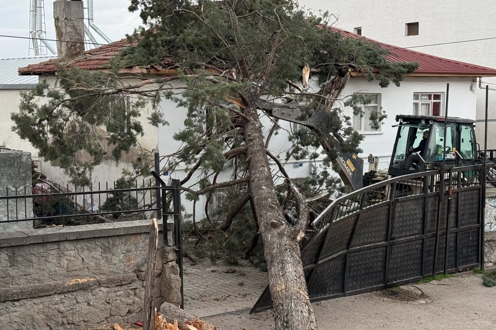 Devrilen çam ağacı nedeniyle Alparslan İlkokulu ve Ortaokulu'nun demir bahçe kapısı ile bahçe duvarlarında da zarar oluştu.