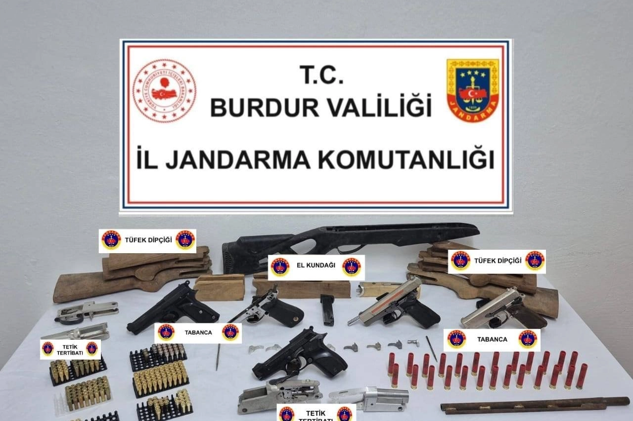 Burdur'da jandarma ekipleri tarafından kaçakçılık ve organize suçlara yönelik düzenlenen operasyonda çok sayıda silah yapımında kullanılan malzeme, mühimmatı ve birçok tarihi eser ele geçirildi.