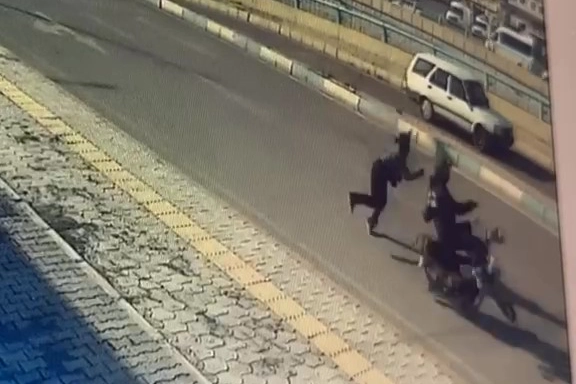 Hatay'da yolun karşısına geçmeye çalışan kadına motosikletin çarptığı anlar güvenlik kamerasına yansıdı.
