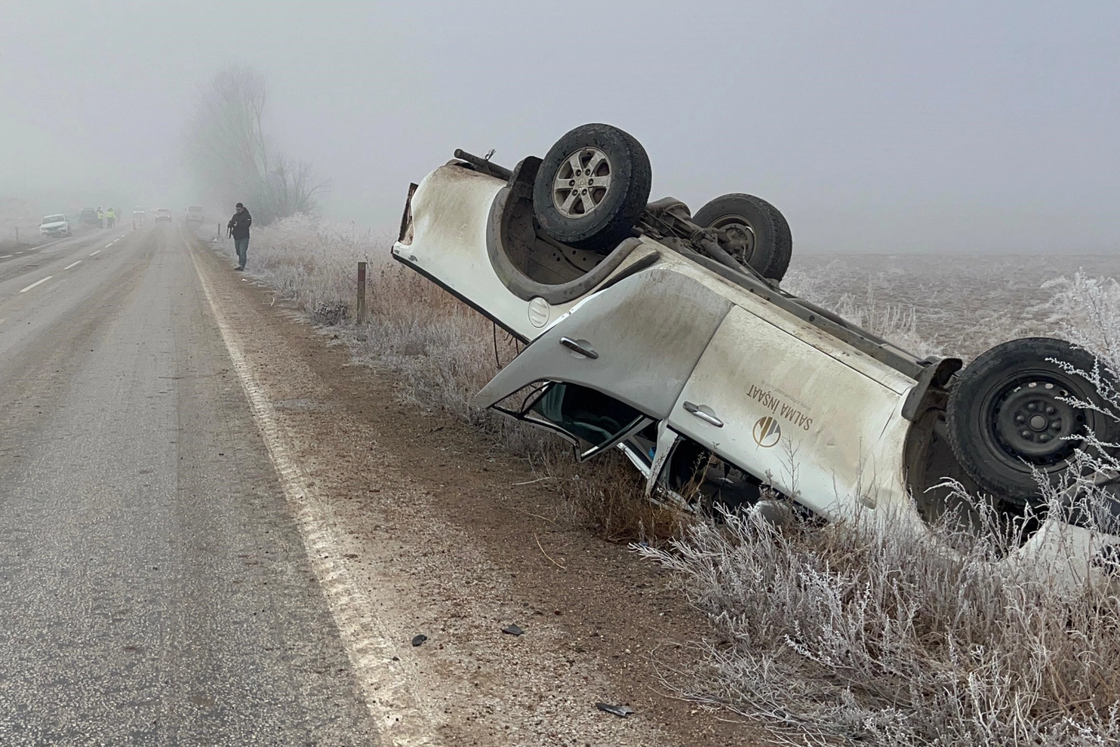 Eskişehir'de kömür yüklü kamyonu sollamaya çalışan kamyonet, gizli buzlanma nedeniyle kontrolden çıktı.
