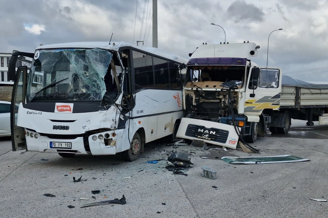 Kaza, Karaman-Ereğli kara yolu üzerindeki kavşakta meydana geldi. Edinilen bilgiye göre, Karaman'dan organize sanayi bölgesinde faaliyet gösteren bir bisküvi fabrikasına işçi taşıyan Mustafa Ç. idaresindeki 70 FV 192 plakalı midibüs, kavşakta dönüş yapan Hüseyin A. idaresindeki 03 SE 547 plakalı çelik demir yüklü tırla çarpıştı.