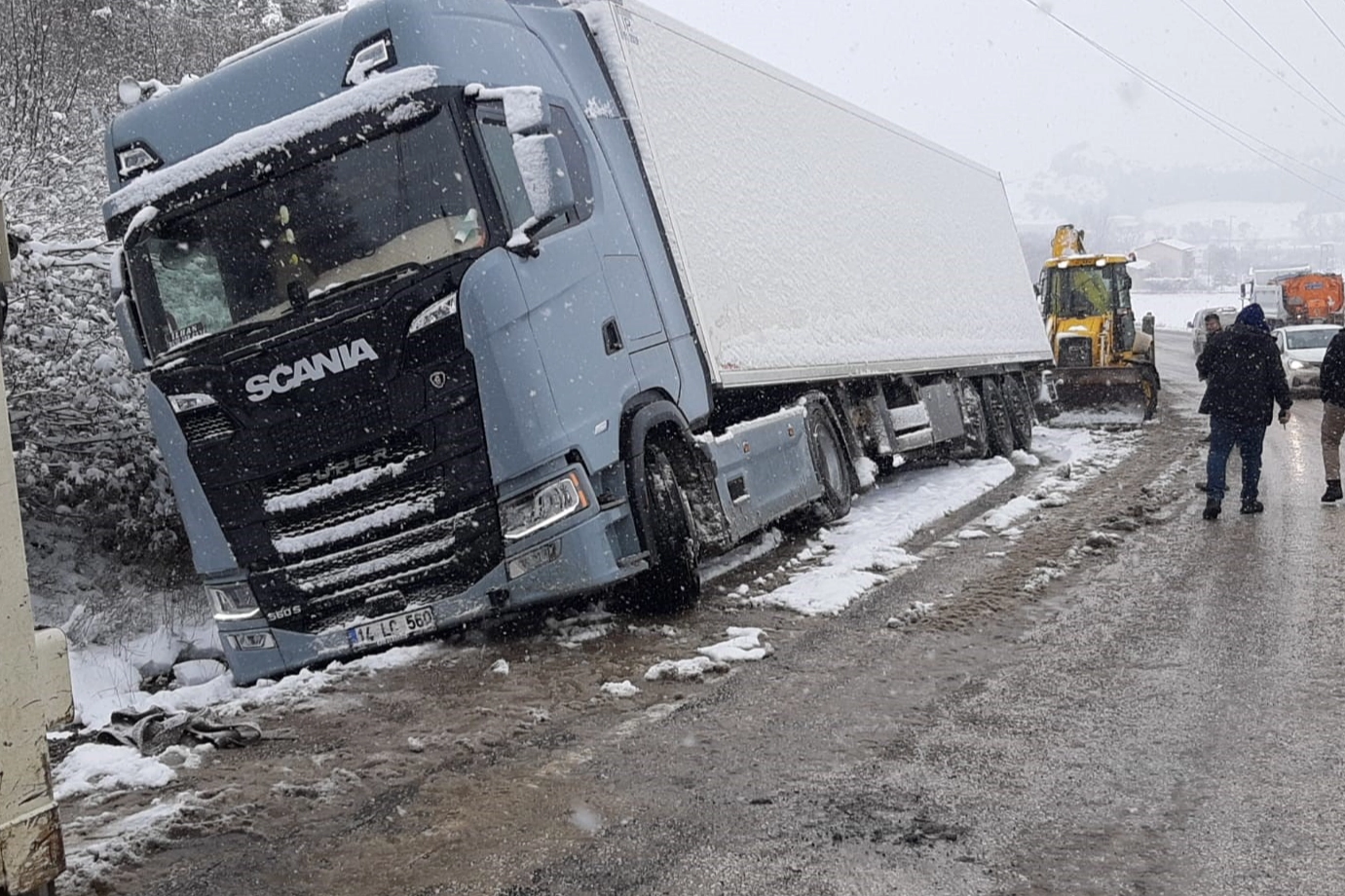 Yan yatan tır, bölgeye sevk edilen 2 iş makinesinin güçlükle yürüttüğü çalışma sonucu kurtarıldı. Kaza, yoğun kar yağışının etkisini sürdürdüğü Mudurnu-Nallıhan karayolu üzerinde meydana geldi. Edinilen bilgiye göre, yolda seyir halinde olan 14 LC 560 plakalı tır, rampaya geldiği sırada zeminin kaygan olması nedeniyle sürücüsünün direksiyon hakimiyetini kaybetmesi sonucu kontrolden çıktı. Savrulan tır, yol kenarındaki şarampole kayarak yan yattı.
