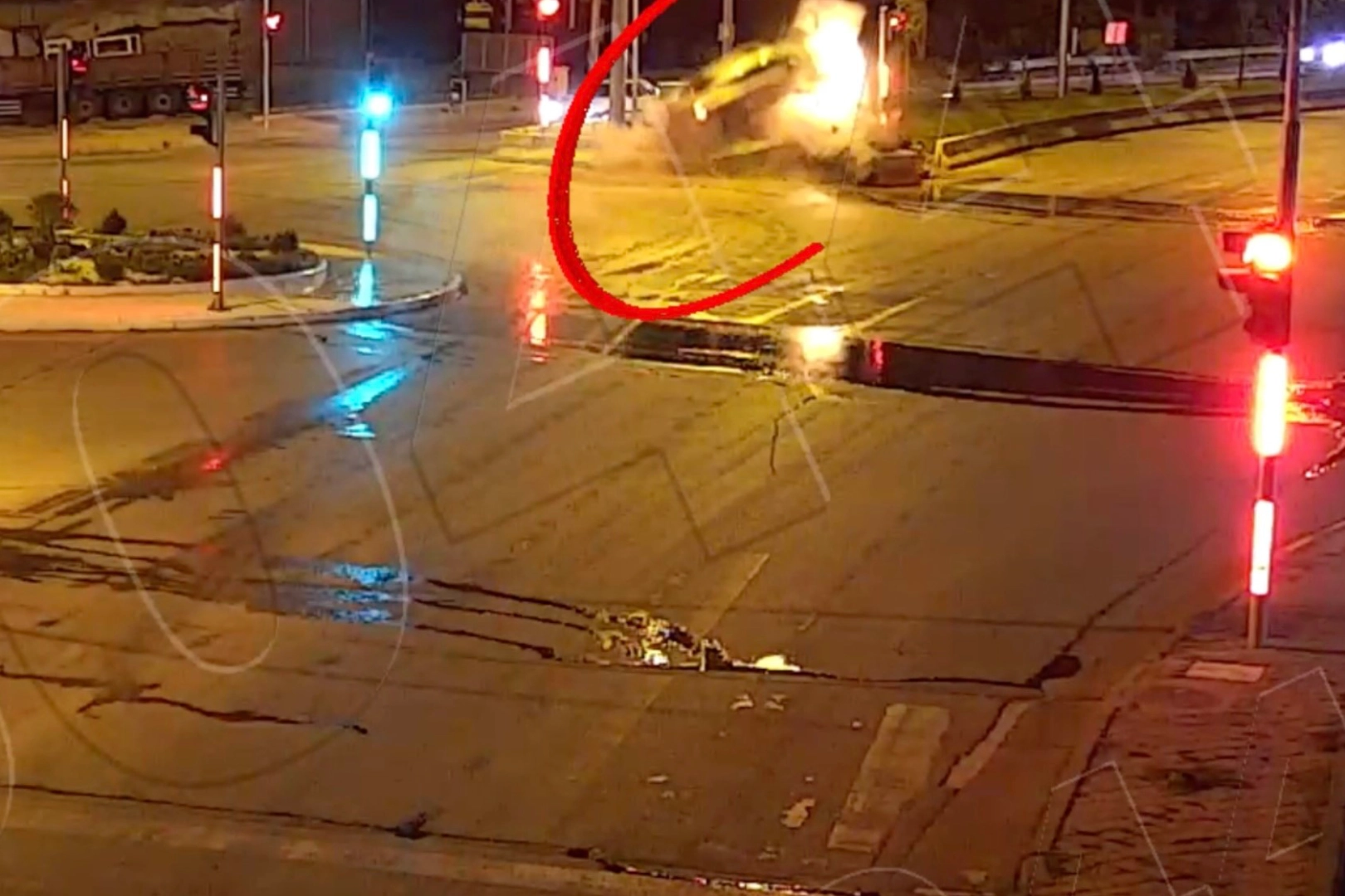 Kaza yapan otomobil yandı Öte yandan, kameraya yansıyan görüntülerde, bir otomobilin sürücüsünün direksiyon hakimiyetini kaybetmesi neticesinde refüjdeki beton bariyerlere ve elektrik direğine çarptığı görülüyor. Çarpmanın etkisiyle otomobilin motor kısmı alevlere teslim oluyor.