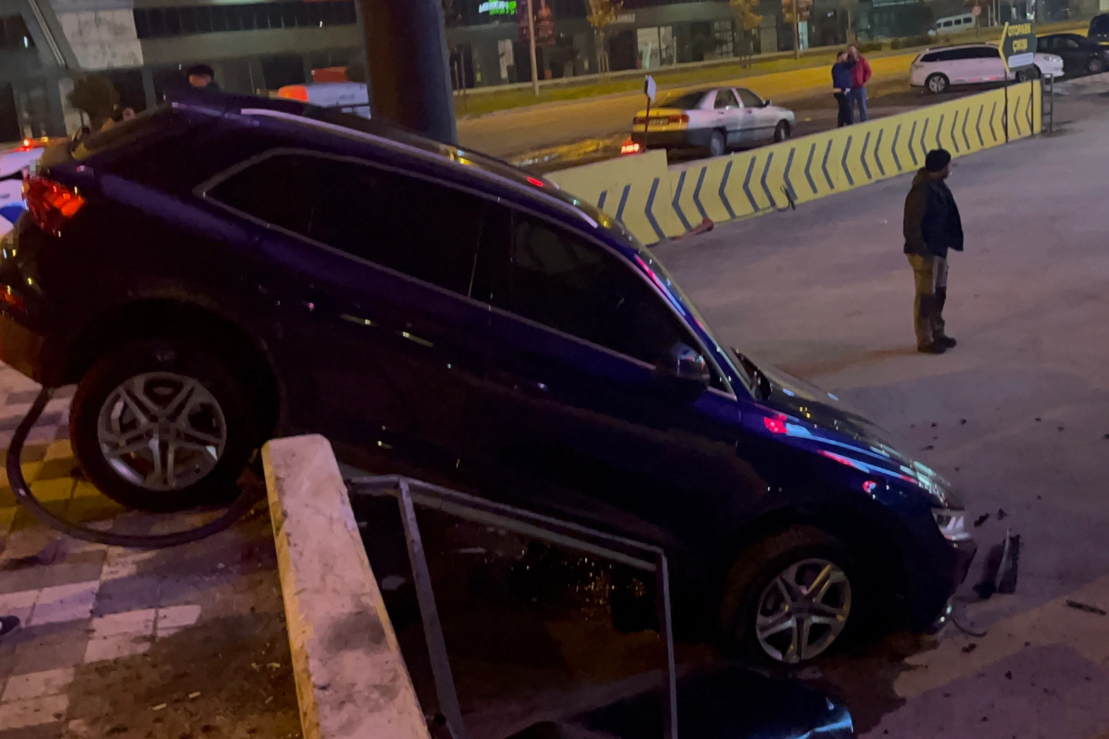 Tekirdağ Çorlu'da virajda bordür taşlarına çarptıktan sonra bir hipermarketin bahçe duvarında asılı kalan otomobilin sürücüsü alkollü çıktı.
