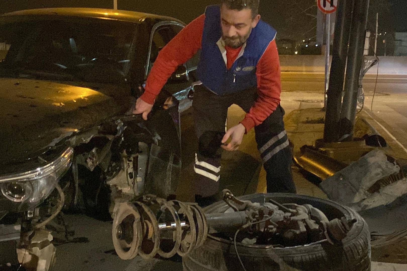 Çarpmanın şiddetiyle otomobilin sol ön tekeri yerinden çıktı. Kazada sürücü H.E. ile arkadaşları N.K. ve E.A.Ç. yaralandı. 112 Acil Çağrı Merkezi'ne yapılan ihbar üzerine olay yerine sağlık ve polis ekipleri sevk edildi. Yaralılar, ilk müdahalelerinin ardından hastaneye kaldırıldı. Kaza ile ilgili inceleme başlatıldı.