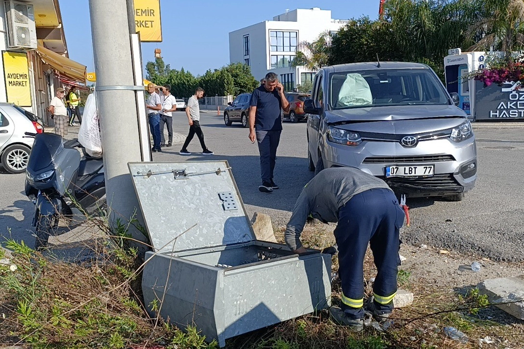 Manavgat’ta kavşak sisteminde hafif ticari araç ile otomobilin çarpışması sonucu meydana gelen kazada kontrolden çıkan araç elektrik panosuna çarparak durabildi.